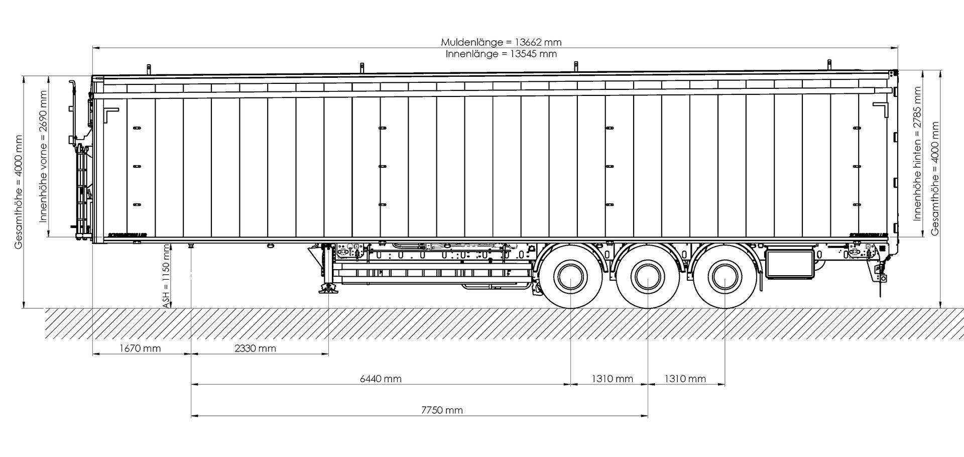 - Axles: 3 x 9 t rigid, wheelbase 2 x 1,310 mm